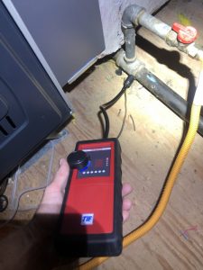 During the course of a home inspection, I use a combustible gas detector to check the accessible gas piping and gas appliance connectors for potential leaks. This typically takes place at the end of the interior home inspection. The device works by first turning it on, and then standing outside, away from any gas exhaust pipes or gas equipment, so that the machine can calibrate itself using the hopefully gas-free outside air as a reference. After about 30 seconds, the combustible gas detector is ready to go. From this point, I retrace my steps throughout the home, stopping at any gas appliance or visible gas piping and place the end of the detector near the joints or connectors of the piping / equipment. My particular device, the TIF-8800, emits a constant noise or beeping sound that gets considerably louder and more obnoxious when it begins to detect any gas. This sound starts of as a gentle “ticking” sound and turns into a full blown whine when natural gas is found.